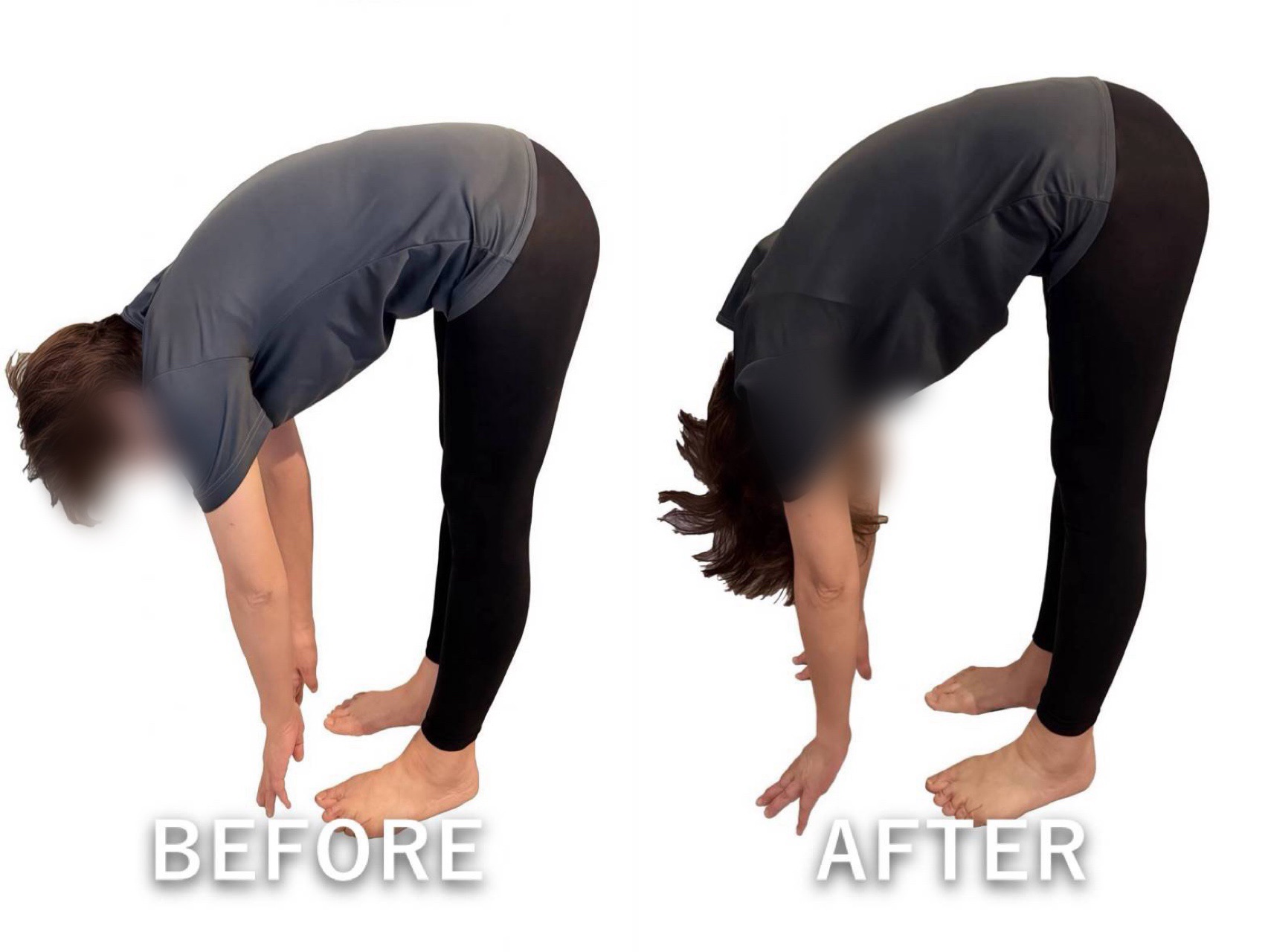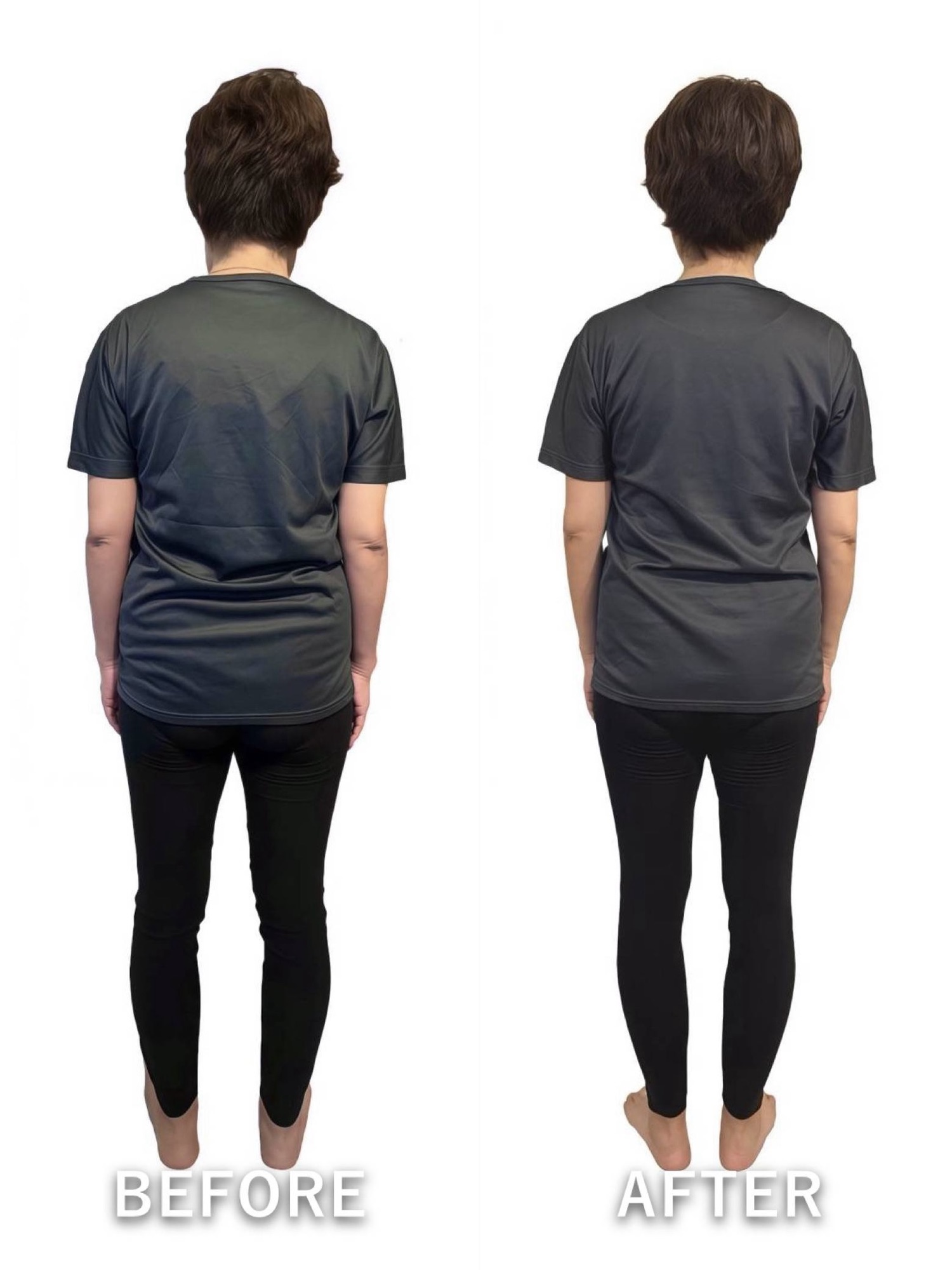 BEFORE & AFTER 2025年10月23日 最終更新日時 : 2025年12月7日 mana \ 60代 女性のお客様です /※レッスン5回の変化です 前傾姿勢だったのが改善され真っすぐ立つことができるようになりました。胸も開きバストの位置も上がっていますね!頭の位置が良くなり顎下もスッキリしました♪上がっていた左肩が下がり左右差が少なくなりました。真っすぐ立てるようになったおかげでウエストラインも綺麗に見えるようになりました! もともと柔軟性はありますが、より股関節の可動域が出て前屈動作がスムーズになりました。頭も自然と背骨の延長線上に下ろすことができています(^^)