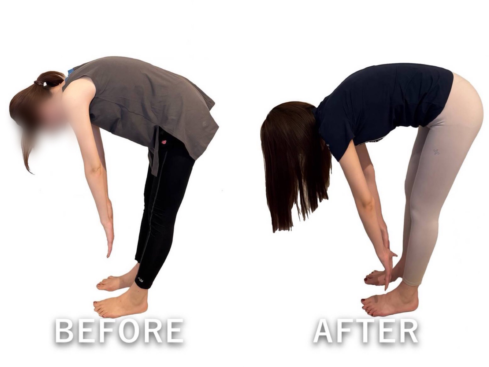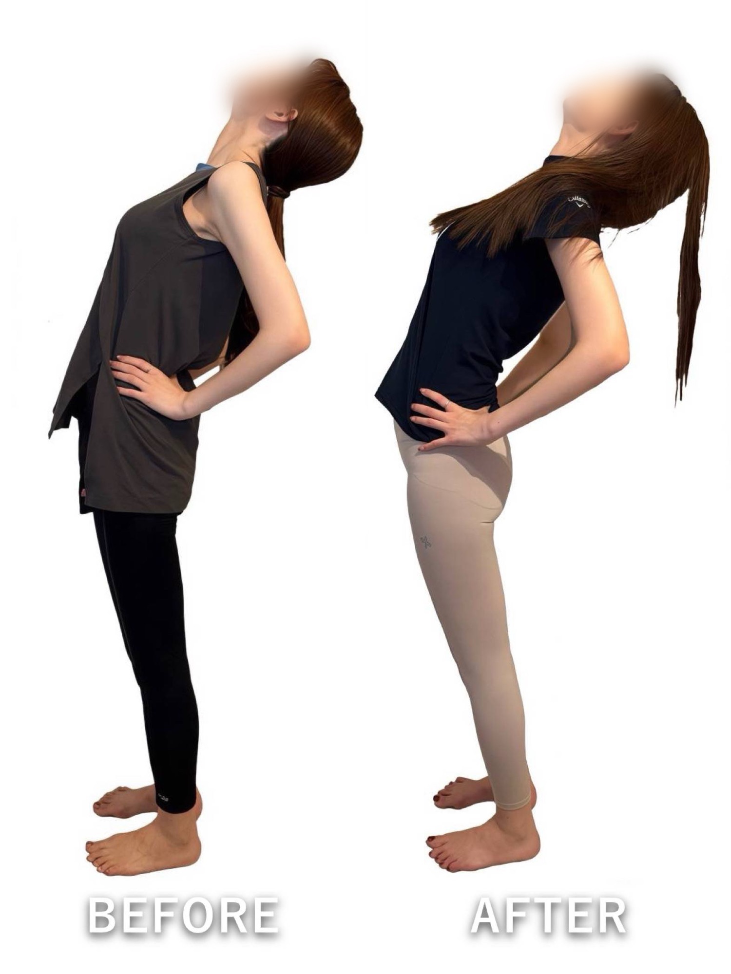 BEFORE&AFTER(6) 2026年2月1日 最終更新日時 : 2026年2月1日 mana \ 30代 女性のお客様です /※レッスン6回の変化です 前屈・後屈ともに可動域が上がりました!前屈動作では腰椎の屈曲が出るようになり、背骨の自然なカーブが作れるようになっています♪